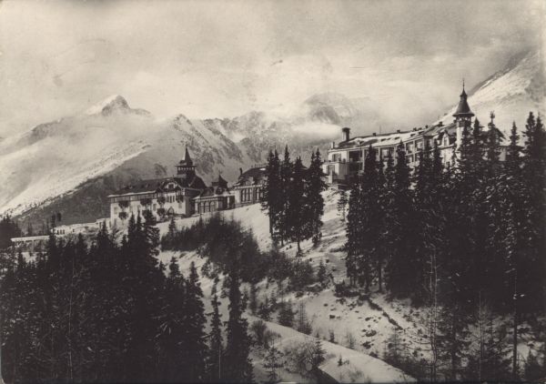 Zimowy widok na Szczyrbskie Jezioro i zabudowania sanatoryjne. Ośnieżony las na pierwszym planie. W tle widok na szczyty: Krywań, Siodełkowa Kopa, Ostra, Solisko.