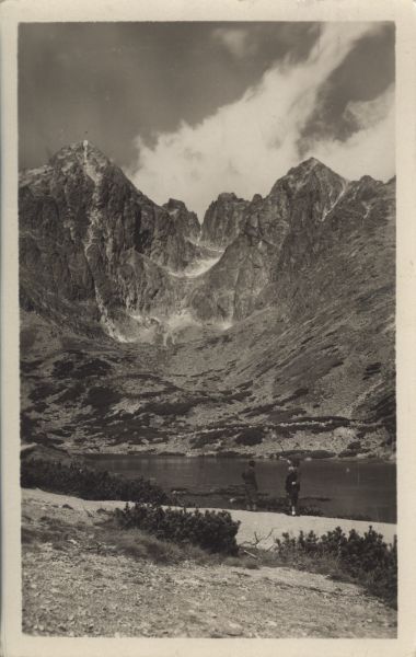 Dolina Łomnicka. W tle Łomnica i Kieżmarski Szczyt. W dole Łomnicki Staw i stoj±cych 2 turystów.