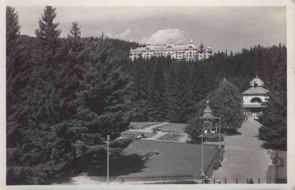 Widok na park oraz budynek hotelowy i otaczający go las. Na ławkach siedzą wypoczywający turyści.