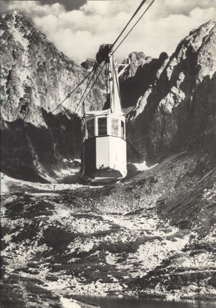 Wagonik kolei linowej nad Dolin± Łomnick±. W dole Łomnicki Staw. W tle Łomnica i Kieżmarski Szczyt.