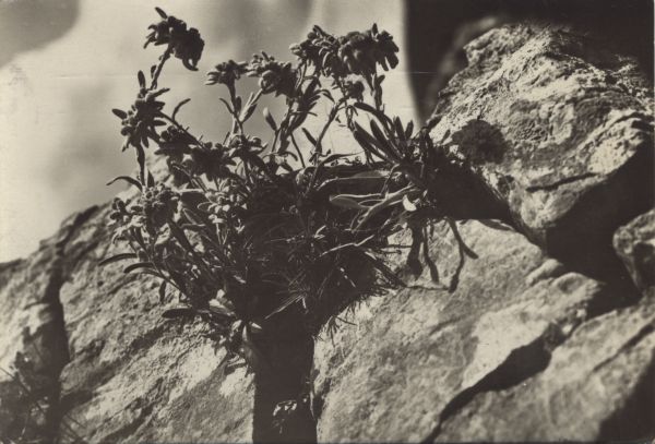 Kwitnąca szarotka alpejska (Leontopodium alpinum) na wapiennych skałach w rejonie Skalnych Wrót (Żelaznej Bramy) w Tatrach Bielskich.