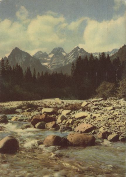 TATRZAŃSKI PARK NARODOWY [Słowacja]. Dolina Żabich Stawów Białczańskich. Z lewej: Młynarz, Wysoka i Niżnie Rysy. Tytuł również w języku: ros., ang., niem.