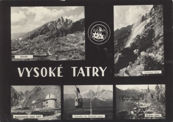 Pocztówka 5. elementowa z atrakcjami turystycznymi miasta Wysokie Tatry. Na kolejnych zdjęciach przedstawiono: Krywań