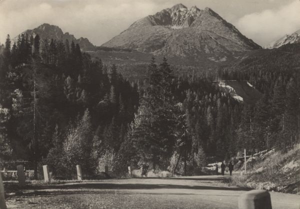 Widok na Gerlach z Tatrzańskiej Polanki. W tle po lewej stronie Kończysta. Na pierwszym planie Droga Wolności, po której idą 3 osoby. W głębi las.