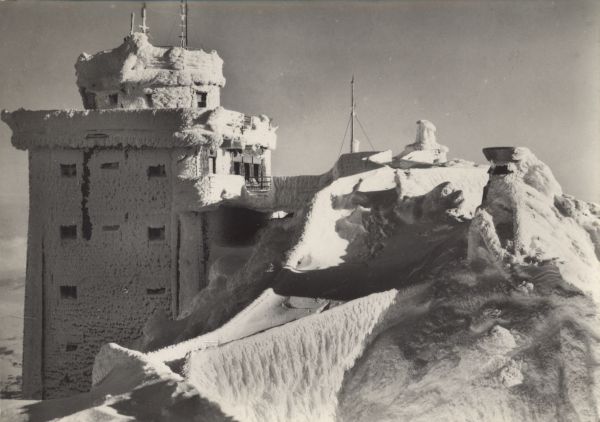 Widok na zaśnieżony budynek stacji kolei linowej na szczycie Łomnicy.