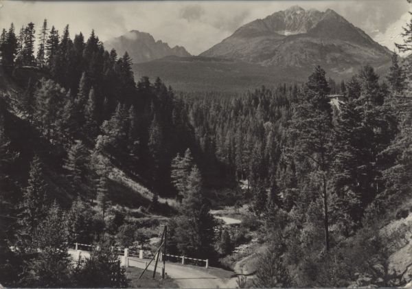 Widok na Kończystą i Gerlach z Tatrzańskiej Polanki. Na pierwszym planie las. W lewym dolnym rogu Droga Wolności.