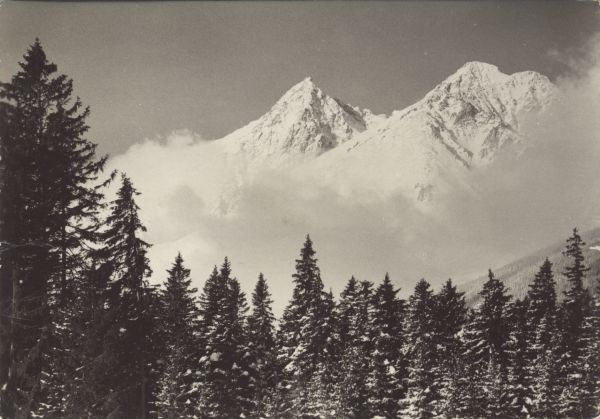 Widok od wschodu na Łomnicê (z lewej), Kieżmarski Szczyt i Mały Kieżmarski Szczyt w zimie. Na pierwszym planie las.