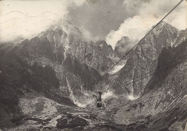 Tatrzański Park Narodowy[Słowacja]. Kolej linowa na Łomnicki Szczyt, po prawej stronie Zachodni Szczyt Wideł, Przełęcz w Widłach, Wielki Szczyt Wideł, Kieżmarski Szczyt.