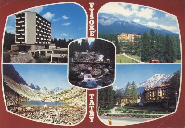 Tatranský národný park. Vysoké Tatry. Horný Smokovec (950 m), hotel Bellevue. Nový Smokovec (1000 m), hotel Park. Veľká Studená dolina, Dlhé pleso (1898 m). Starý Smokovec (1010 m), hotel Grand, v pozadí Slavkovský štít (2452 m). Vodopád Studeného potoka pri chate Kamzík.