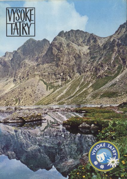 Dolina Mięguszowiecka. Widok znad Wielkiego Stawu Hińczowego na Wielki Mięguszowiecki Szczyt (z lewej), Po¶redni Mięguszowiecki Szczyt i Mięguszowieck± Przełęcz pod Chłopkiem. U góry po lewej stronie napis: VYSOKÉ TATRY, na dole po prawej logo miasta VYSOKÉ TATRY.