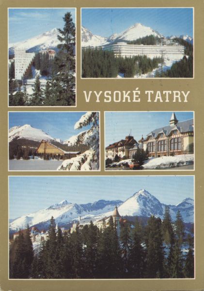 Sanatoria Krywań, Hviezdoslav i Willa Janosik. W tle Krywań, grań Ostrej, Szczyrbskie Solisko i Szczyrbski Szczyt. Pomiędzy zdjęciami napis: Vysoké Tatry.