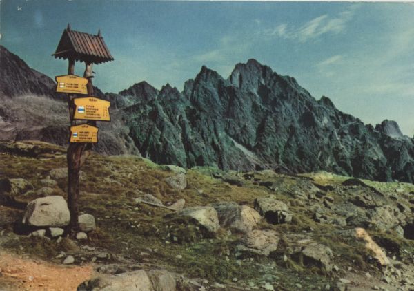 Na pierwszym planie kierunkowskaz turystyczny. W tle widać Pośrednią Grań i Żółty Szczyt.
