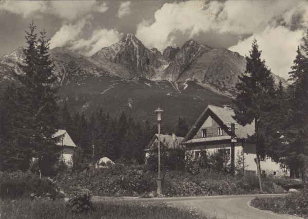 Widok na grupę Łomnicy z Tatrzańskiej Łomnicy. Na pierwszym planie droga i zabudowania w osadzie Tatrzańska Łomnica.