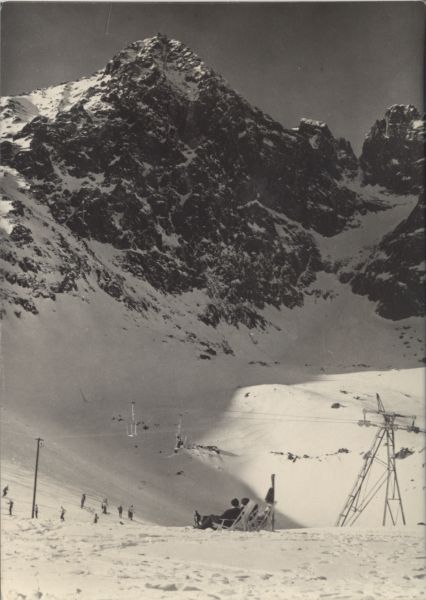 Zimowy widok na Łomnicę i Dolinę Łomnicką. Na pierwszym planie Lejkowy Kocioł, w nim kolej linowa krzesełkowa, wypoczywający turyści i narciarze.