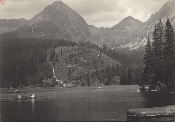 Widok na Szczyrbskie Jezioro. Na stawie tury¶ci pływaj±cy w łódkach. W tle szczyty, od lewej: Ostra, Wielkie Solisko, Szczyrbski Szczyt i Baszty.