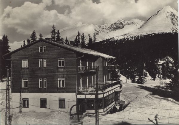 Widok na Hotel Solisko w scenerii zimowej. W tle las i szczyty: Krywań, Siodełkowa Kopa, Ostra, Skrajne Solisko.