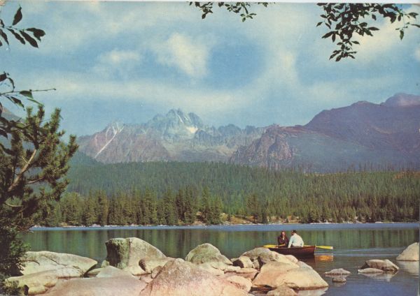 Na pierwszym planie dwoje turystów w łódce na jeziorze. W tle panorama Tatr. Widać od lewej: Popradzką Kopę, Wysoką i Tępą.