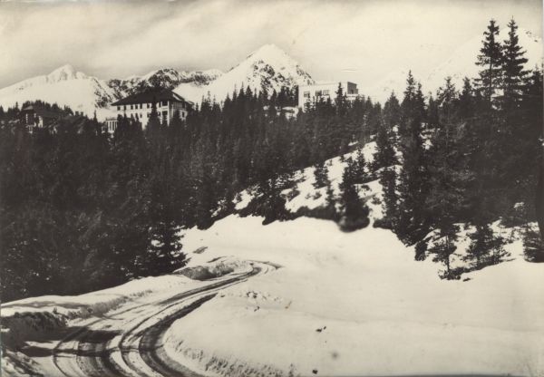 Zwi±zkowy Dom Wypoczynkowy w osadzie Nowe Szczyrbskie Jezioro w zimowej scenerii. Na pierwszym planie droga i las. W tle: Krywań, Siodełkowa Kopa, Ostra, Solisko, Szczyrbski Szczyt, Skrajna Baszta.