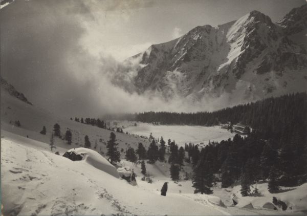 Widok na Popradzki Staw i Dolinę Mięguszowiecką z Doliny Złomisk w scenerii zimowej. Nad wschodnim brzegiem stawu widoczny hotel górski kpt. Moravki otoczony lasem. W tle południowa grań Skrajnej Baszty oraz Mała Baszta.