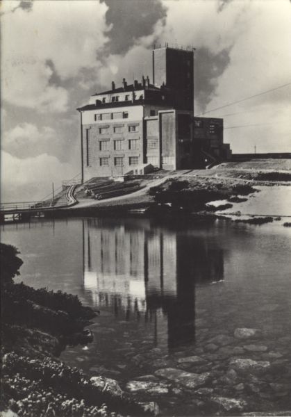 Widok na budynek stacji kolei linowej oraz hotel Encián nad Łomnickim Stawem. Budynek odbija się w wodzie.