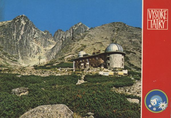 Widok na Obserwatorium Astronomiczne Słowackiej Akademii Nauk w Dolinie Łomnickiej. W tle widać Łomnicę, Grań Wideł, Kieżmarski Szczyt i Huncowski Szczyt. Napis: VYSOKÉ TATRY i logo miasta VYSOKÉ TATRY.