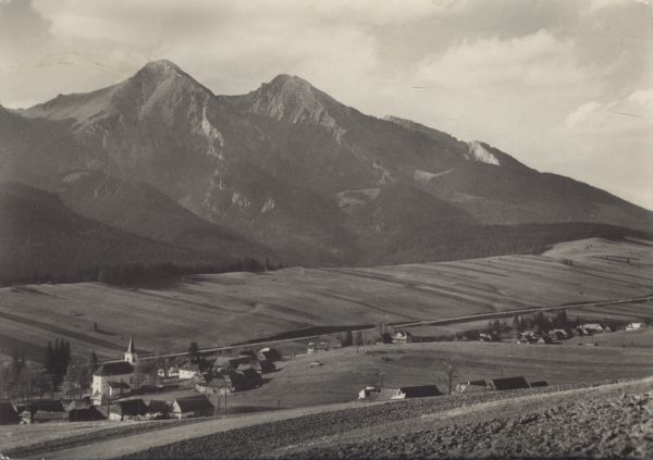 Widok na Zdziar. Na pierwszym planie ko¶ciół i zabudowania wiejskie. W tle Płaczliwa Skała i Hawrań.