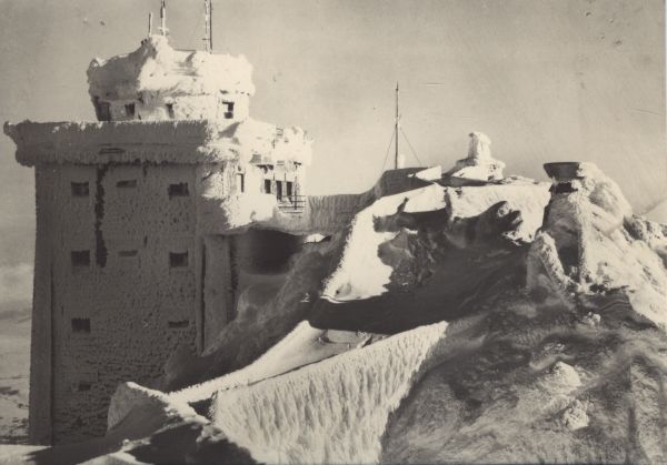 Widok na zaśnieżony budynek stacji kolei linowej na szczycie Łomnicy.