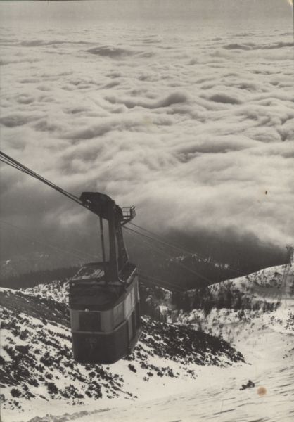 Wagonik kolei linowej na Łomnicę w scenerii zimowej. W tle morze mgieł.
