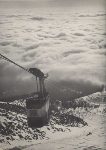 Wagonik kolei linowej na Łomnicę w scenerii zimowej. W tle morze mgieł.