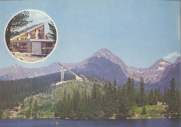 Pocztówka 2. elementowa. Panorama Szczyrbskiego Jeziora - widoczna skocznia, las i szczyty gór. U góry po lewej stronie zdjęcie Hotelu FIS.