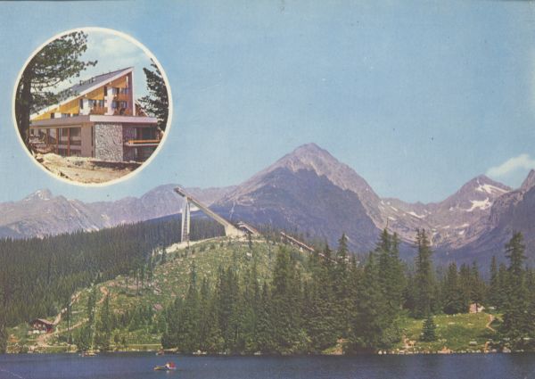 Pocztówka 2. elementowa. Panorama Szczyrbskiego Jeziora - widoczna skocznia, las i szczyty gór. U góry po lewej stronie zdjęcie Hotelu FIS.