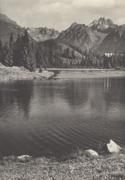 Widok na Nowe Szczyrbskie Jezioro. W tle szczyty: Skrajna Baszta, Wołowy Grzbiet, Kopa Popradzka, Wysoka, Osterwa.