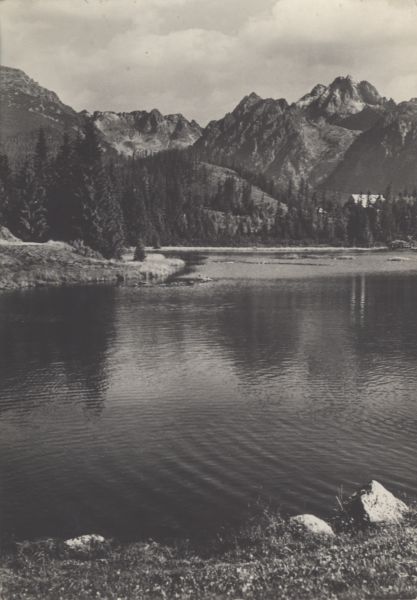 Widok na Nowe Szczyrbskie Jezioro. W tle szczyty: Skrajna Baszta, Wołowy Grzbiet, Kopa Popradzka, Wysoka, Osterwa.