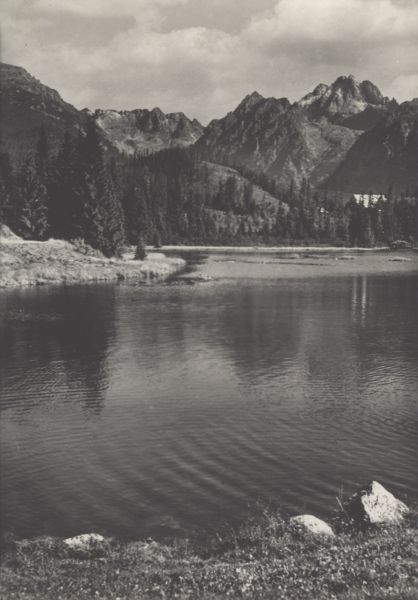 Widok na Nowe Szczyrbskie Jezioro. W tle szczyty: Skrajna Baszta, Wołowy Grzbiet, Kopa Popradzka, Wysoka, Osterwa.