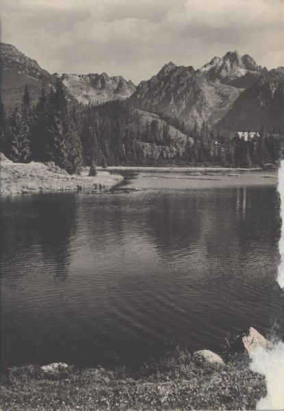 Widok na Nowe Szczyrbskie Jezioro. W tle szczyty: Skrajna Baszta, Wołowy Grzbiet, Kopa Popradzka, Wysoka, Osterwa.
