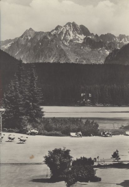 Widok na Szczyrbskie Jezioro. W tle Kopa Popradzka, Ciężki Szczyt, Wysoka, Smoczy Szczyt, Ganek i Rumanowy Szczyt. Na pierwszym planie bulwar przy jeziorze z ławeczkami i siedz±cymi na nich turystami.
