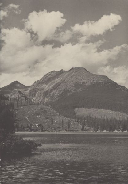 Widok na Szczyrbskie Jezioro. W tle: Szczyrbski Szczyt, Grań Baszt ze Skrajn± Baszt±. Po lewej stronie widoczna stara skocznia narciarska.
