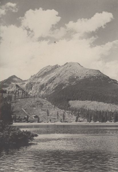 Widok na Szczyrbskie Jezioro. W tle: Szczyrbski Szczyt, Grań Baszt ze Skrajn± Baszt±. Po lewej stronie widoczna stara skocznia narciarska.