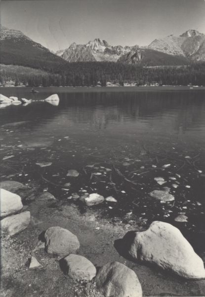Widok na Szczyrbskie Jezioro. Na pierwszym planie głazy, w oddali człowiek płynący łódką. W tle Wysoka.