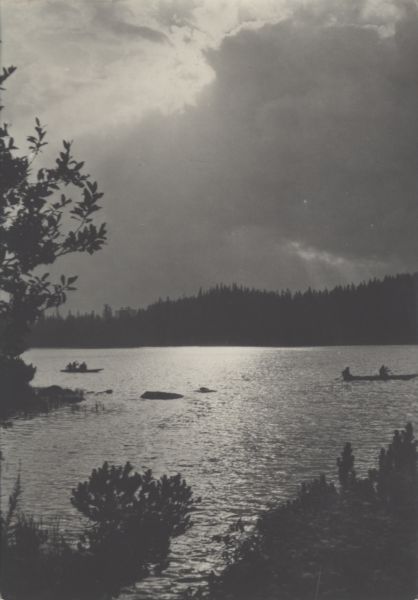 Widok na Szczyrbskie Jezioro. Na jeziorze pływaj±ce łódki. Zachmurzone niebo.