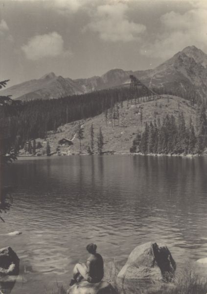 Szczyrbskie Jezioro. Widok na Krywań, Ostr± oraz Skrajne i Szczyrbskie Solisko. Na pierwszym planie turysta nad wod±. Na stoku skocznia narciarska otoczona lasem.