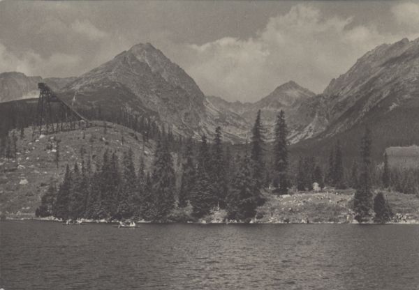 Widok ze Szczyrbskiego Jeziora na Dolinę Młynick±. Po lewej Szczyrbskie Solisko, na wprost Szczyrbski Szczyt, po prawej stoki grani Baszt. Po jeziorze pływaj± dwie łódki.