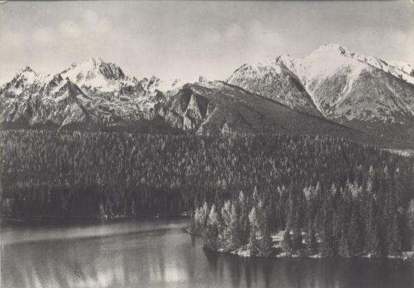 Widok na Szczyrbskie Jezioro i otaczające go lasy. W tle pokryte śniegiem wierzchołki szczytów - od lewej: Kopa Popradzka, Wysoka, Tępa i Kończysta. Z przodu Osterwa.