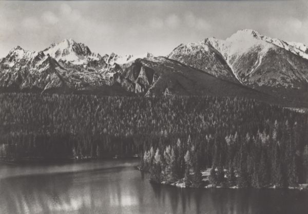 Widok na Szczyrbskie Jezioro i otaczające go lasy. W tle pokryte śniegiem wierzchołki szczytów - od lewej: Kopa Popradzka, Wysoka, Tępa i Kończysta. Z przodu Osterwa.