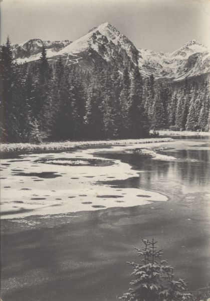 Widok na Nowe Szczyrbskie Jezioro czę¶ciowo pokryte lodem. Za nim las, w tle Ostra, Wielkie Solisko i Szczyrbski Szczyt.