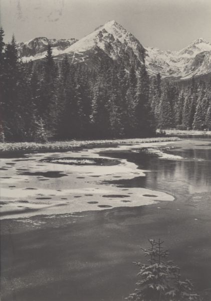 Widok na Nowe Szczyrbskie Jezioro czę¶ciowo pokryte lodem. Za nim las, w tle Ostra, Szczyrbskie Solisko i Szczyrbski Szczyt.