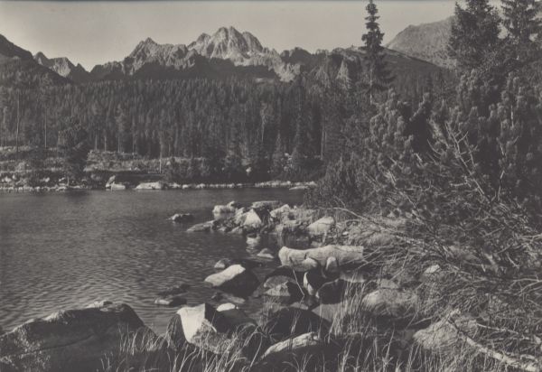 Widok na Wysoką znad Szczyrbskiego Jeziora. Na pierwszym planie brzeg jeziora z głazami w wodzie i kosodrzewiną (Pinus mugo Turra) na brzegu. W głębi las. W tle od lewej szczyty: Żabi Koń, Kopa Popradzka, Wysoka i Osterwa (z przodu po prawej stronie).