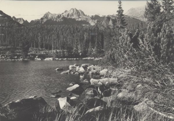 Widok na Wysok± znad Szczyrbskiego Jeziora. Na pierwszym planie brzeg jeziora z głazami w wodzie i kosodrzewin± (Pinus mugo Turra) na brzegu. W głębi las. W tle od lewej szczyty: Żabi Koń, Kopa Popradzka, Wysoka i Osterwa (z przodu po prawej stronie).