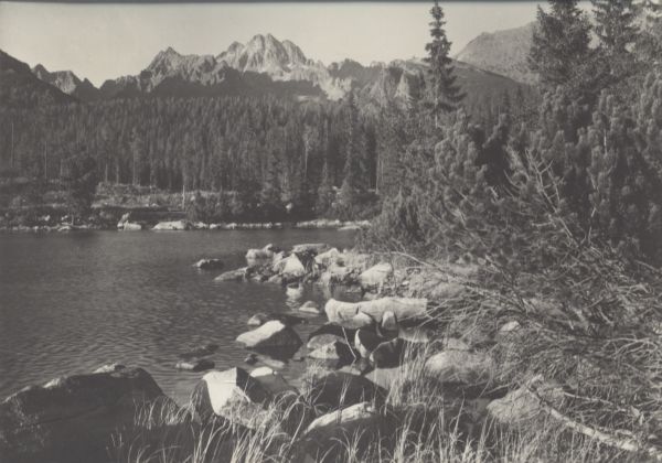 Widok na Wysok± znad Szczyrbskiego Jeziora. Na pierwszym planie brzeg jeziora z głazami w wodzie i kosodrzewin± (Pinus mugo Turra) na brzegu. W głębi las. W tle od lewej szczyty: Żabi Koń, Kopa Popradzka, Wysoka i Osterwa (z przodu po prawej stronie).