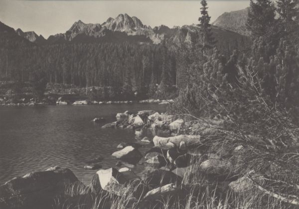 Widok na Wysoką znad Szczyrbskiego Jeziora. Na pierwszym planie brzeg jeziora z głazami w wodzie i kosodrzewiną (Pinus mugo Turra) na brzegu. W głębi las. W tle od lewej szczyty: Żabi Koń, Kopa Popradzka, Wysoka i Osterwa (z przodu po prawej stronie).